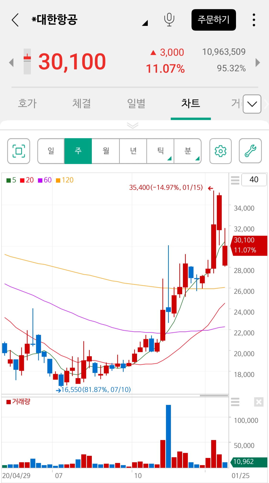 대한항공 주식을 예전에 그냥 맛보기로 몇주를 사놓고 묵혀놓고 있었는데 오랜만에 확인해보니 급등했다가 엄청 급락한 그래프를 볼 수 있었다.