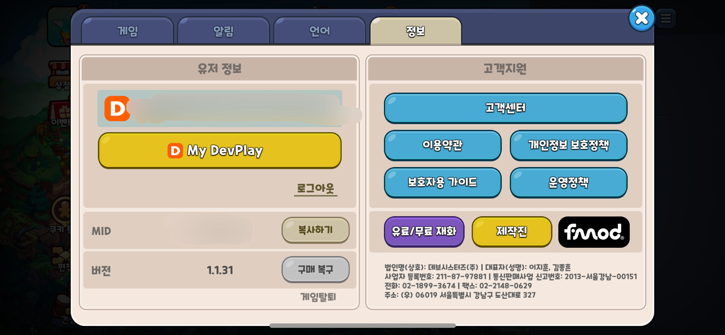 게임아이디는 게임화면 우측상단에 메뉴에 들어가서 환경설정 > 정보로 가면 아래와 같은 화면에서 알 수 있다.
